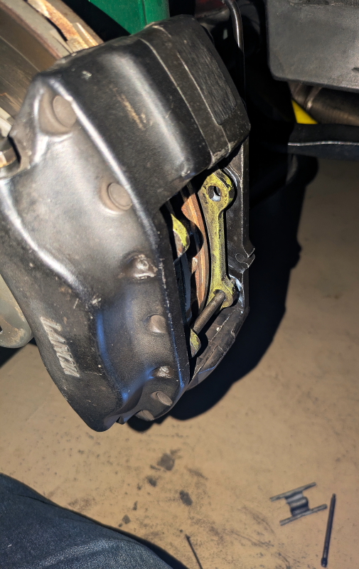 ディスクパッド内外を入れ替えて有った事、スライドピンのブーツが破かれて居た。